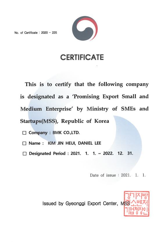 Promising Export Small and Medium Enterprise 페이지 정보 작성자 비엠케이 작성일21-01-22 10:56 조회2,937회 관련링크 이전글 다음글 목록 본문 'Promising Export Small and Medium Enterprise' by Ministry of SMEs and Startups(MSS), Republic of Korea 이전글 다음글 목록
